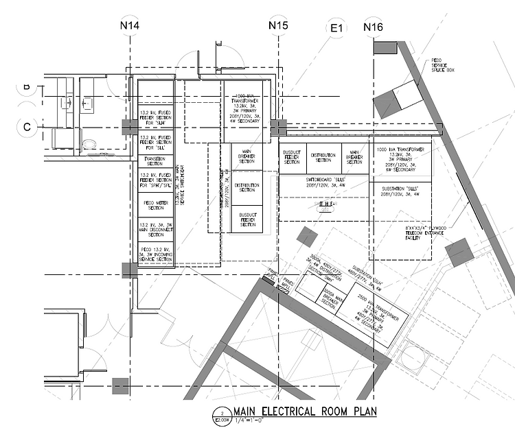 In the diagram below a layout is given to the electical contractor in order to layout the distribution and layout of the elctrical systems within the mechanical substations. This is used to allocate space for the seperate pieces of equipment and layout the systems in a location that makes sense for the distibution to the upper levels. This is helpful for a contractor in design who can determine where placement of systems should be.